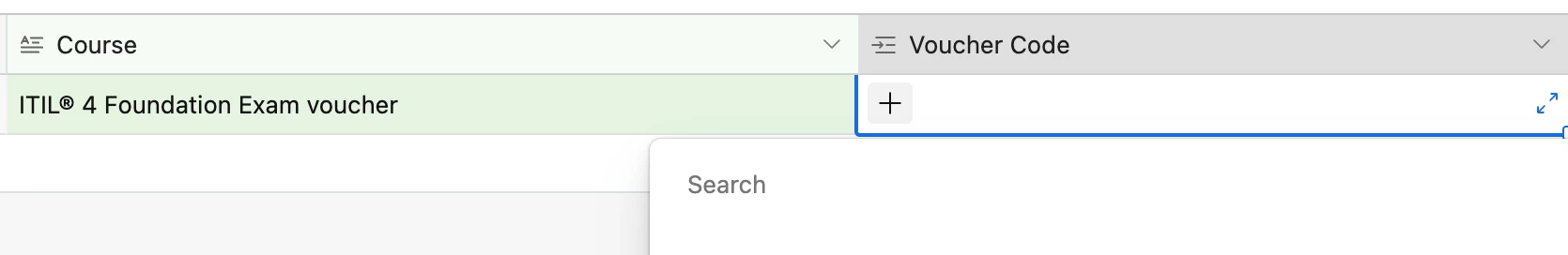 For example, if the Course says ITIL 4 Foundation w/TAKE2, it should only show voucher codes that are titled ITIL 4 Foundation w/TAKE2. And if it the Course says ITIL 4 Foundation, it should only show voucher codes that are titled ITIL 4 Foundation, and so on.