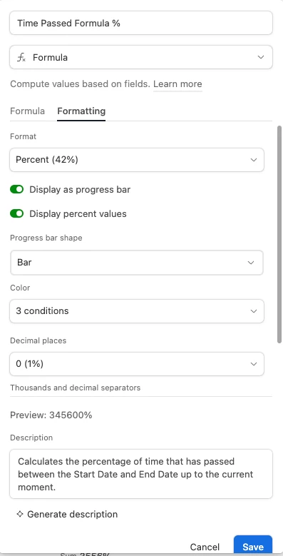 However, when I go into the "Formatting" section of the Formula Field, it gives me a very large percentage which seems to be incorrect (in this particular case the preview shows 345600% but in the formula section, the preview shows 35.56%. I have attached the two images of the settings below: