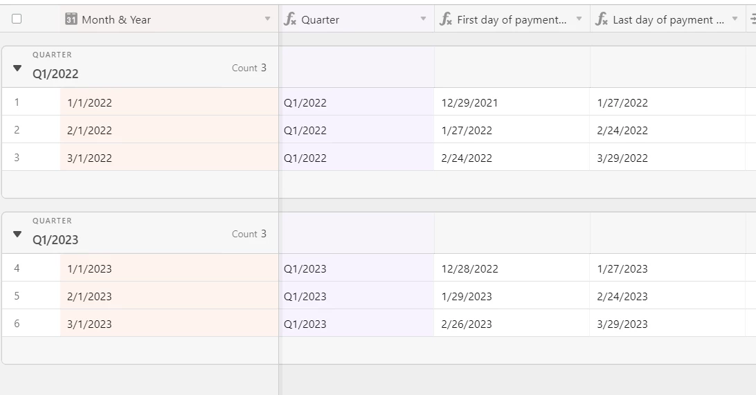 For example - for January 2023 income, he'd be looking at payments between December 28th and January 27th instead of January 1 - 31. I've created columns with formulas that give me the "first date of payments" and "last date of payments" for each month.