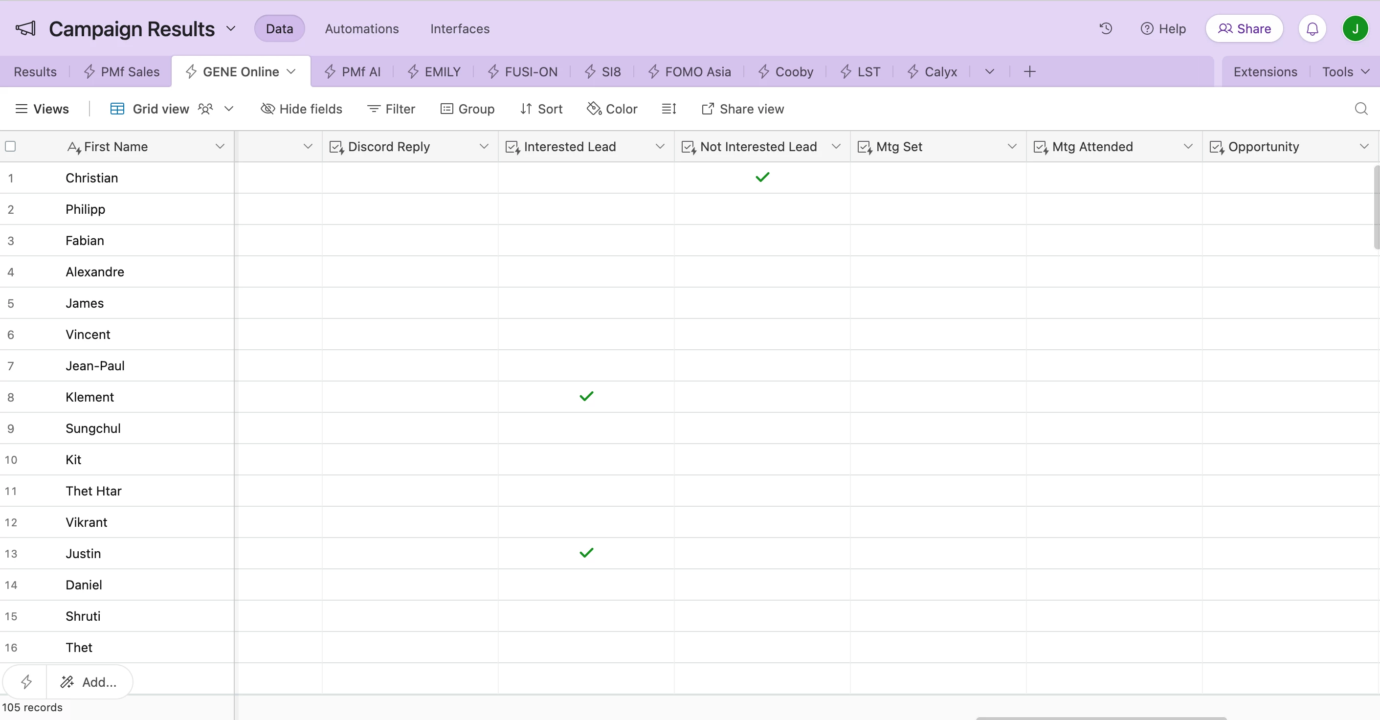 I have this table in which each tab has a column with a checkmark ('Interested Lead'). I would like to sum up the total number of checkmarks in the 'Interested Lead" column across all the tabs in this table.