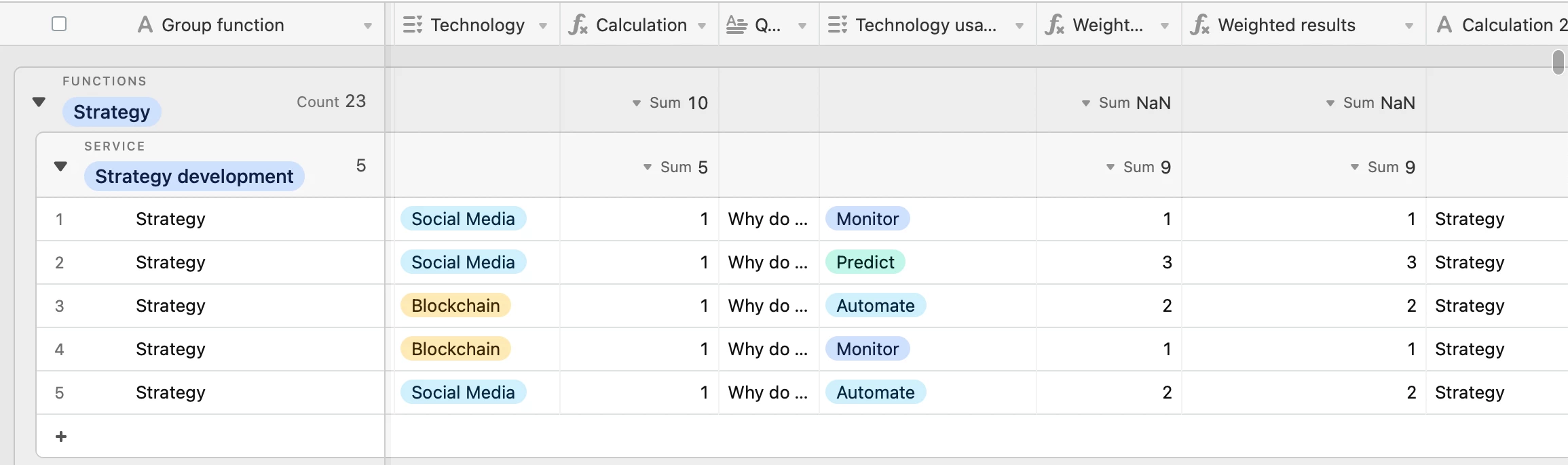 I'd like to sum up the values from the "Weitghted results" column, when "Technology"=Social Media, or when "Technology"=Blockchain