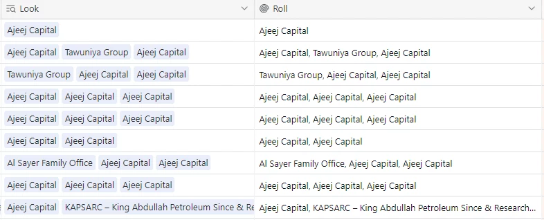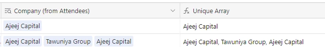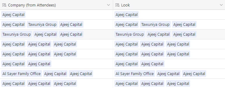 I have my calendar synced - then I have a column of attendees, which is linked to companies. So each row has the different company in the email, but obviously , it can have the same company more than once, given you can have several people from one company.