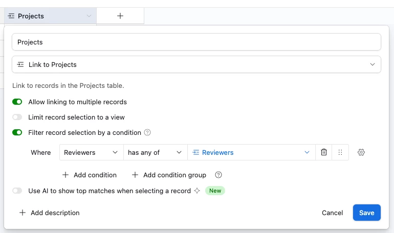 In another field, they need to select the project they are reviewing. I would like to filter the projects that are options to be just the ones the review is assigned to.