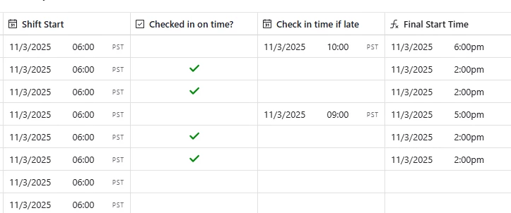 I am hoping to use a formula to capture clock-in time for employees. Intended functionality is that if the box is checked, log the shift start time as actual start time. If the box is unchecked, override the shift start time with actual time captured in another column. Search results said the formula to use is IF({Checked in on time?}, {Shift Start}, {Check in time if late}). The formula captures a time, but it does not match either date field.