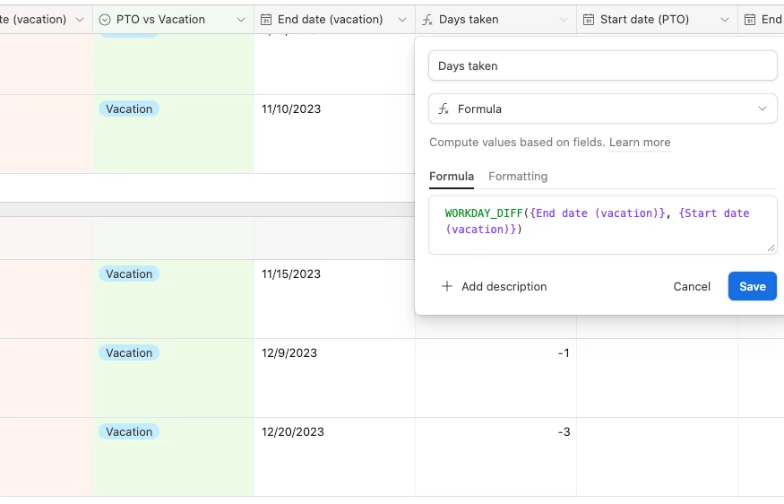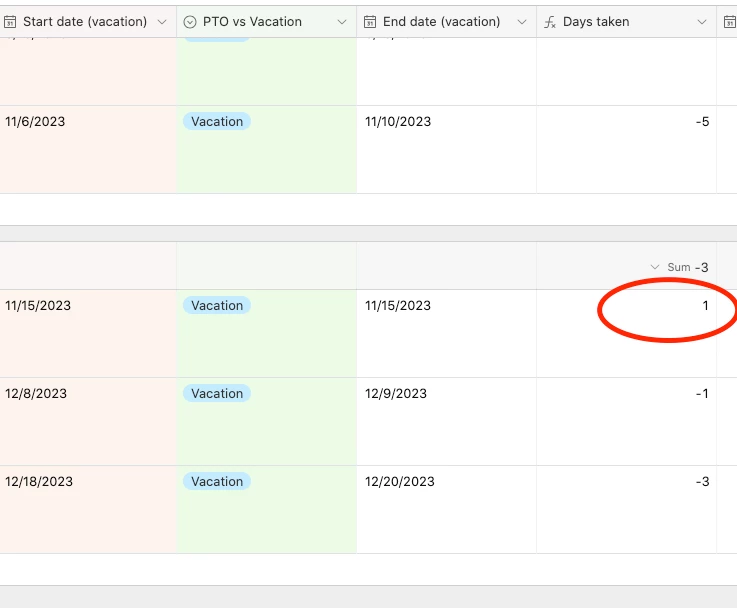 I am having trouble with my vacation day calculation when an employee is only taking one day off. I have a formula to count the days requested and they always show up as negative which is what I want to subtract from their approved days, but when they request 1 day is comes up as a +1 and throws the calculation off. Could someone help me with this? I know it has to be a simple fix. Thanks!