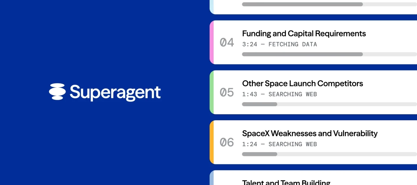 When you ask Superagent a question, you're not asking one AI assistant to perform sequential, checklist-style tasks. You're getting a coordinating agent that plans the work, deploys specialists who work in parallel, and synthesizes their output into a finished, highly polished deliverable you can immediately use.