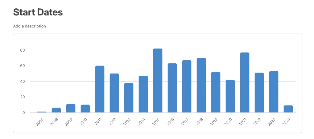 Each of our customer records have a "start date" and an "end date" when they were active. I can easily graph the "start dates" (see attachment) but this doesn't show our cumulative numbers including people who are still active customers. If someone stops being a customer, I still want them to be counted for the years they were active, but not from their cutoff date.