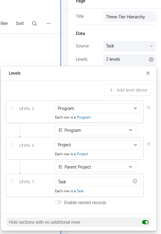 (1) Enable the ‘Hide sections with no additional rows’ toggle. At the page level (i.e. the whole page is blue bordered, not just your list view), inside the Levels (hierarchy) control, right at the bottom. It has moved around over the years, in case you were used to seeing this control back out inside the list view.