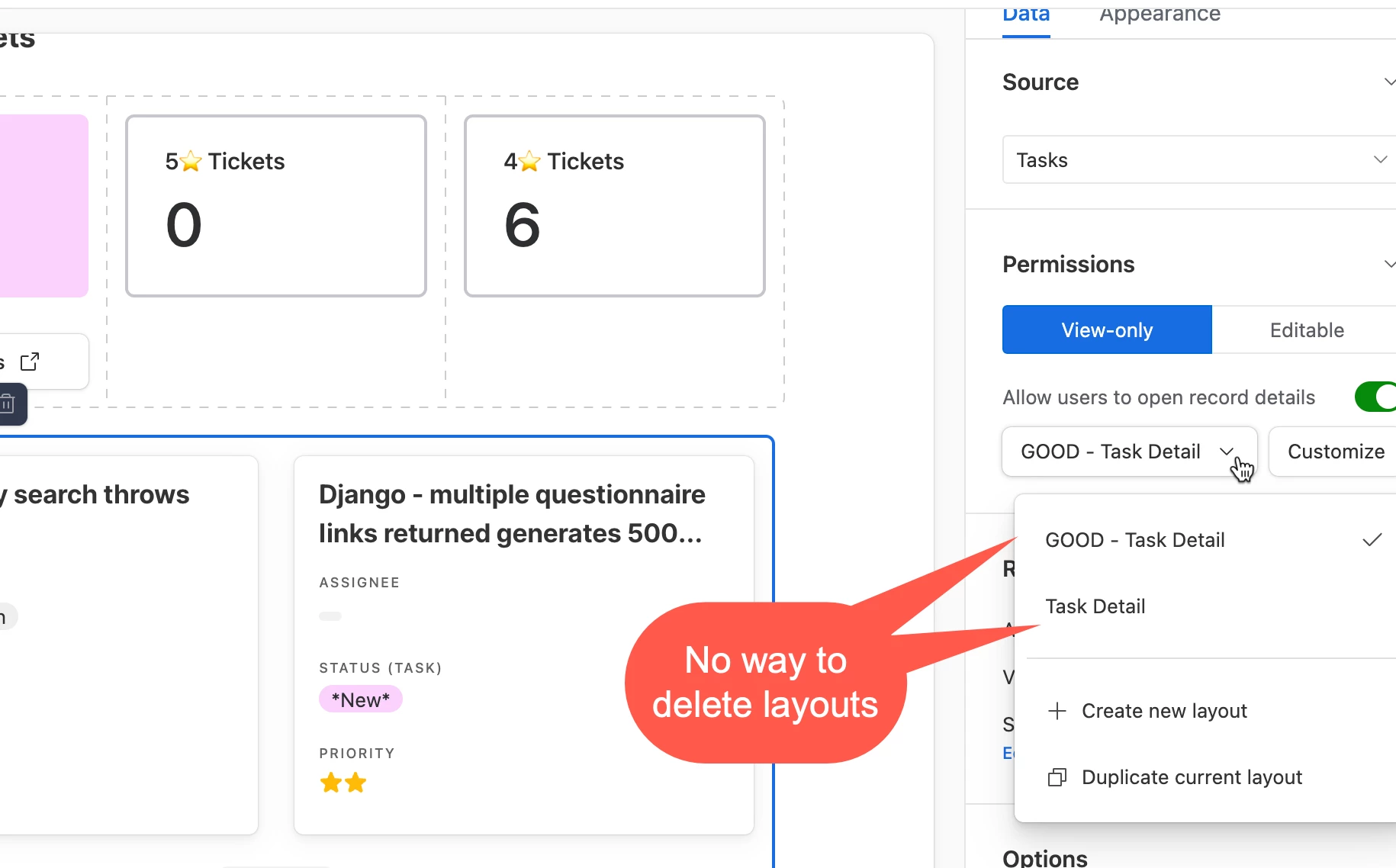 I have a whole bunch of excess layouts that I was experimenting with and it has made a mess of my ability to apply the right layout setting because the dropdown has tonnes of bad layout options that, and I like to delete them so that the don't get inadvertently applied across my interface.
