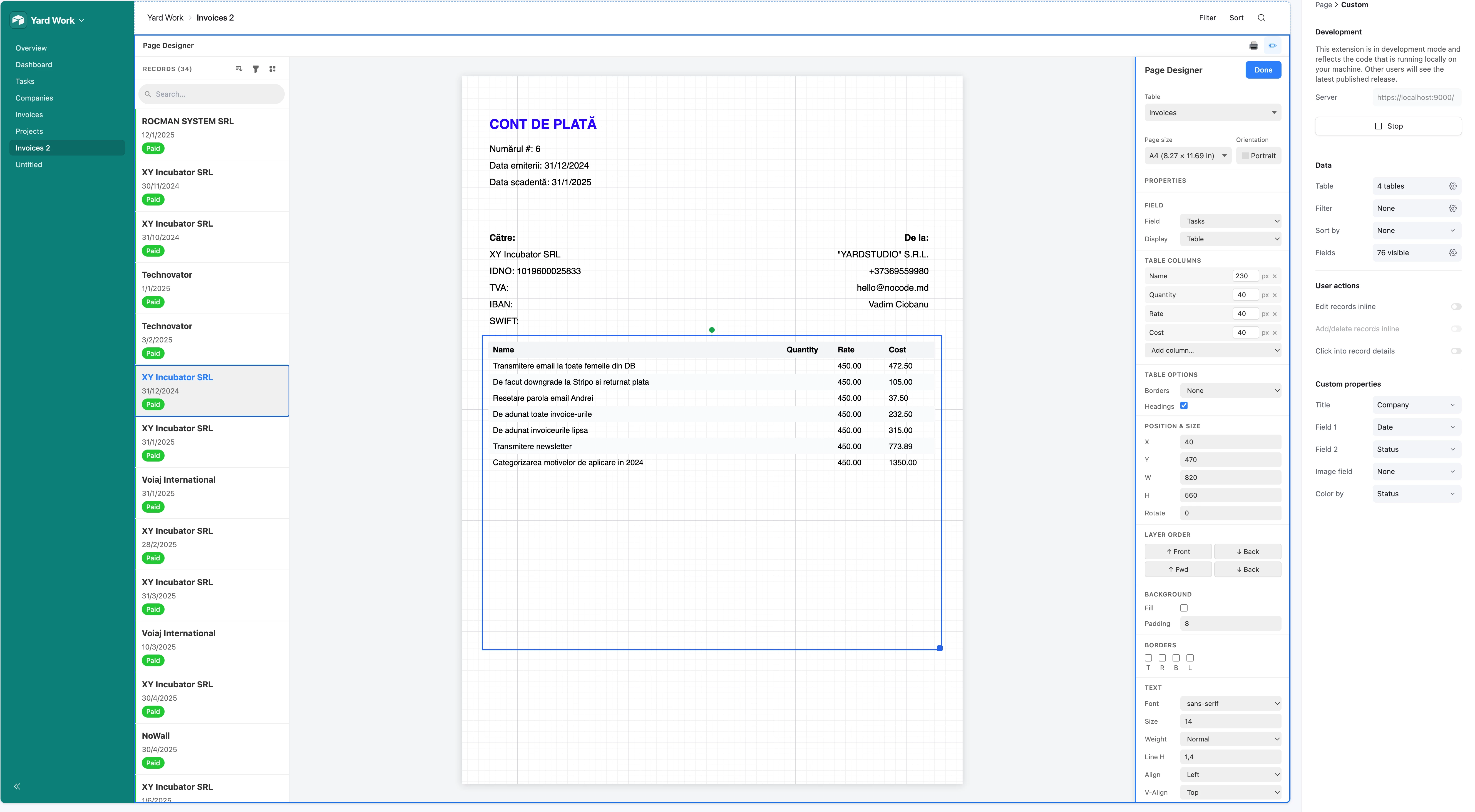 - 🔗 Linked record fields in Table mode — displays related records as a mini-grid, with configurable columns, column widths, and headings (this is what you see in the screenshot — an invoice with a live task table pulled from a linked table)