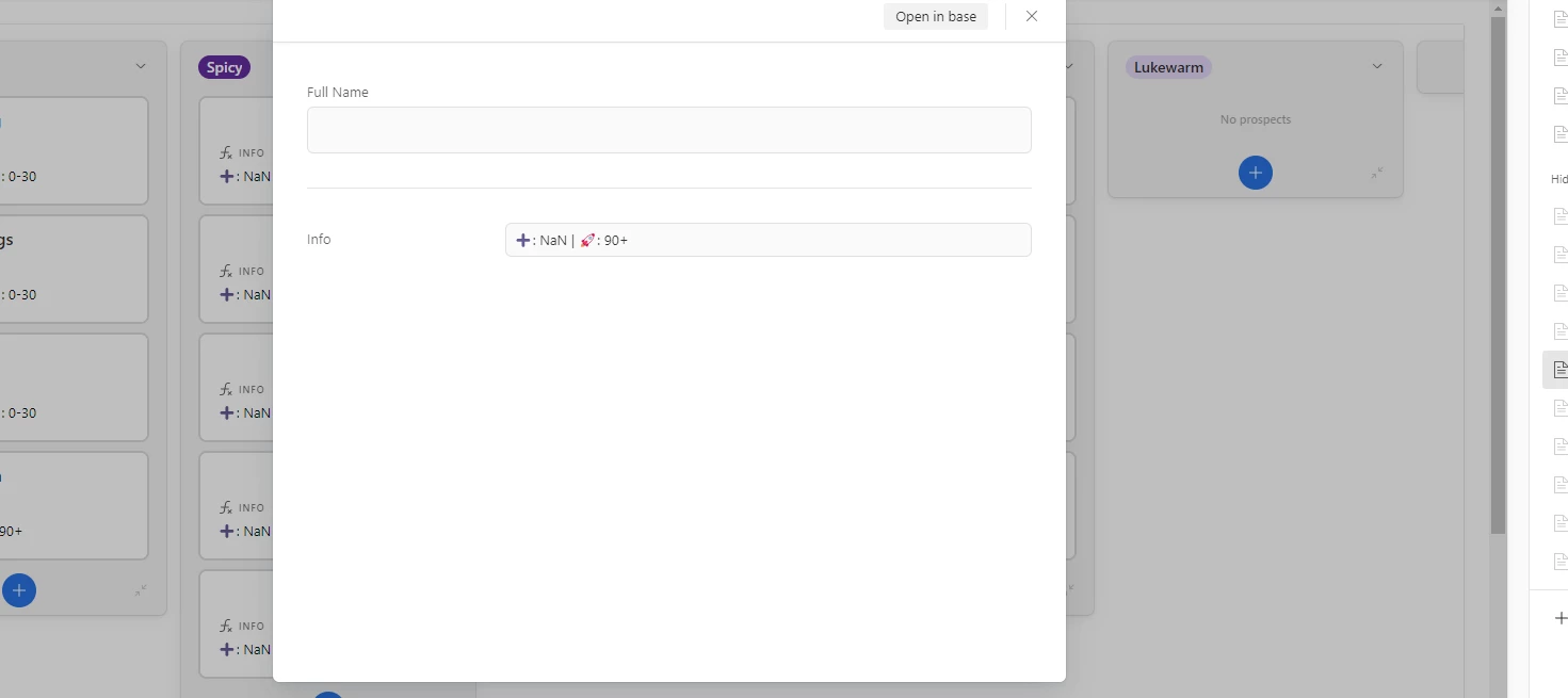 Only the fields that show on the record as they appear in the Kanban stacking field itself show up on the 'add a new record' form.