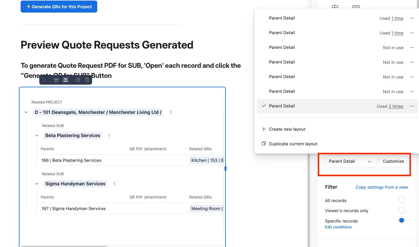 The “Generate QR PDF for Sub” button in the individual QR record also seems to be working as it should but I would like to be able to generate these by both Project and individual QR, not just the individual QR, which I can’t figure out how to do.