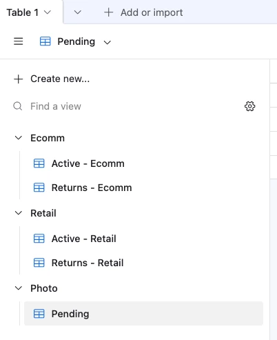 Can someone guide me on whether there is a way to nest views under major topics/departments? For example, our photo team might want to have different ‘Views’ they use, but I want to group all of their views under one department. Our ecomm team also has different views, but I want to nest them all under ecomm. I work with between multiple departments, so I want to see views grouped by department (photo, ecomm, production, retail, etc.).