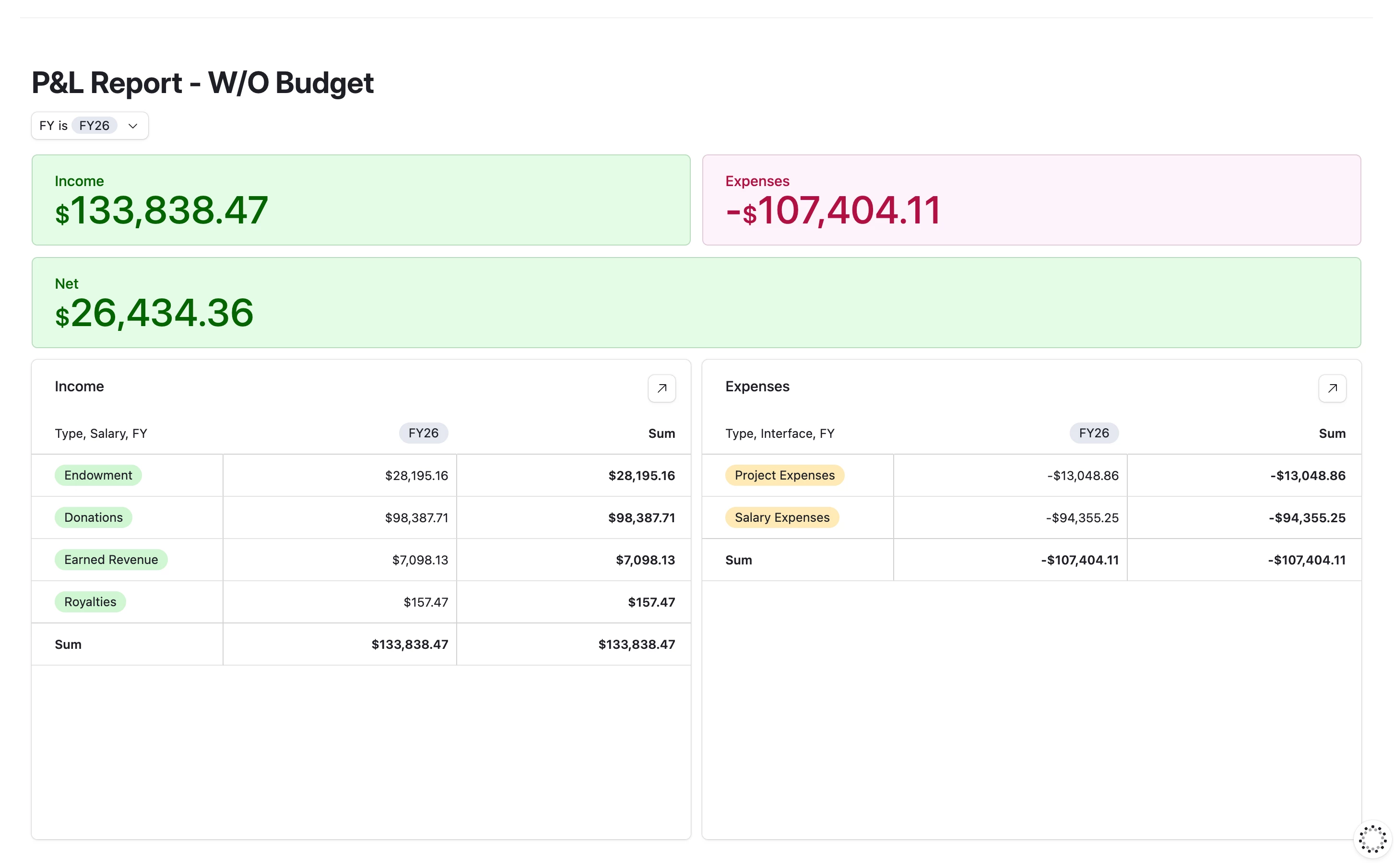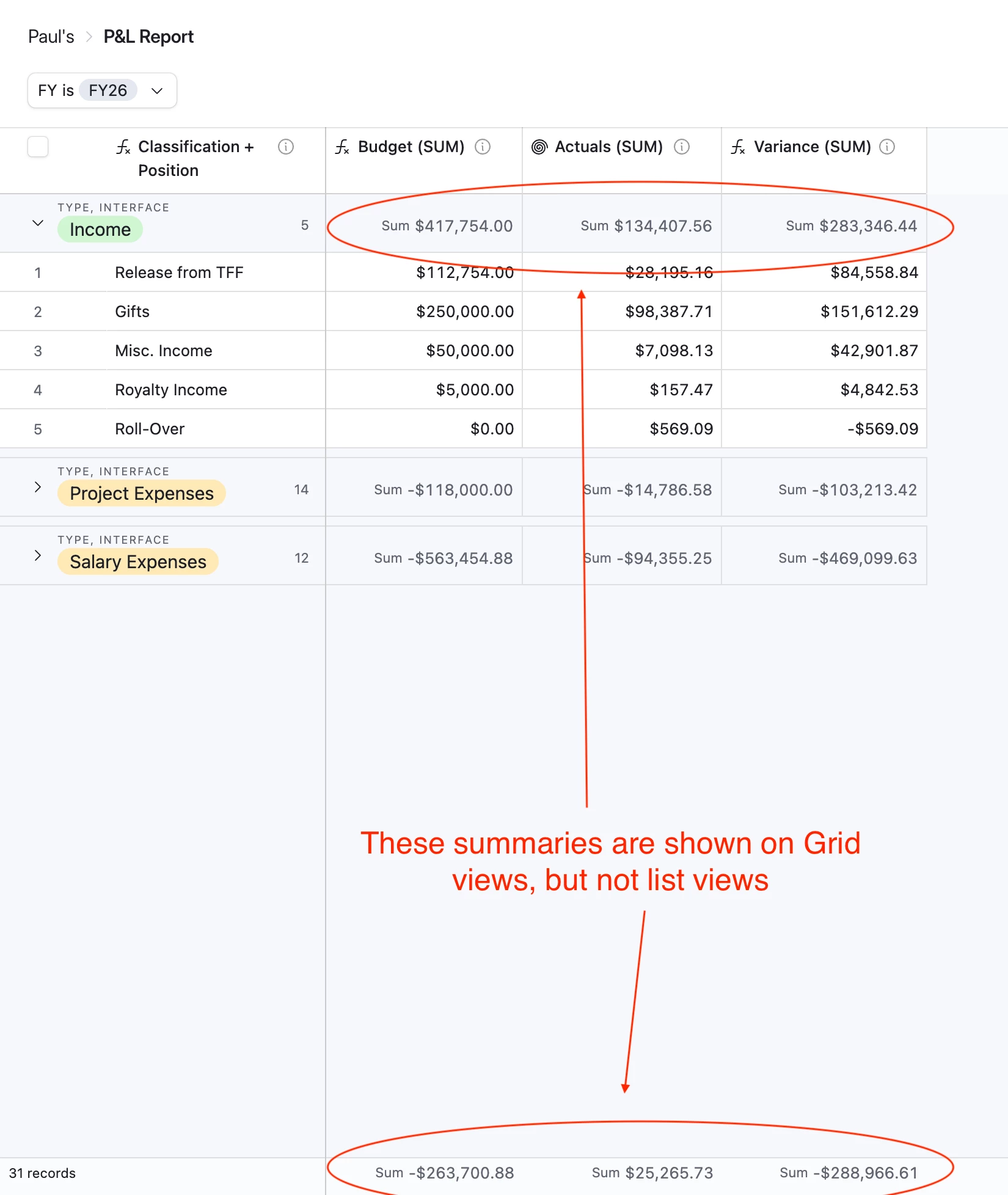 My use case: I’d like to use the Grid element for budgeting (e.g., building a profit and loss view). Grids can summarize currency and number fields, whereas Lists cannot. Ideally, I’d display income, expenses, and net totals as summary cards at the top, with a Grid below showing detailed line items. While a pivot table works for some of this, it can’t display all necessary fields (like 3 separate columns for budget, actuals, and difference/variance). (see screenshot)