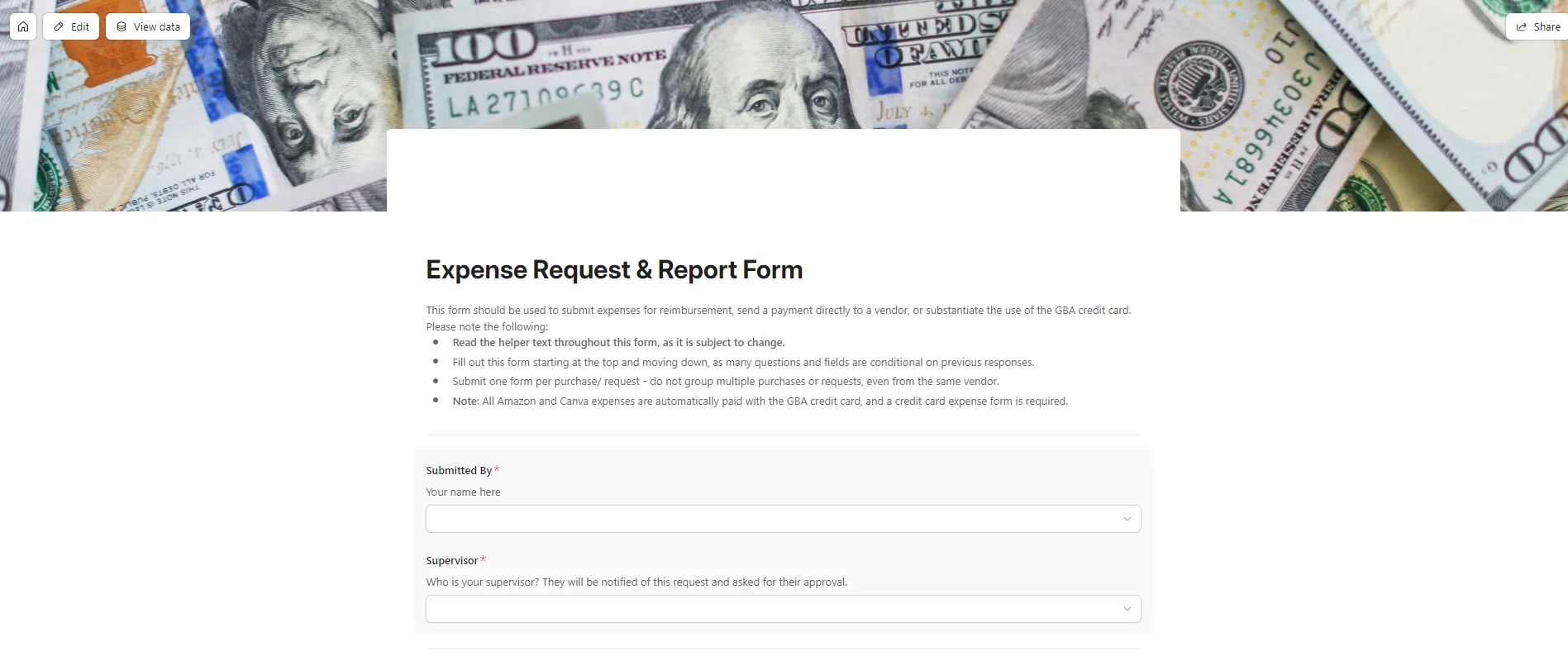 I just created a form using the newer form builder for the staff to use to submit expense reports, reimbursement requests, etc. All staff have editor permission on our "Expenses" base, where the form populates to. When the staff opens the form, there are buttons along the top of the form that allows them to navigate home, edit the form, or view the data (see picture attached).