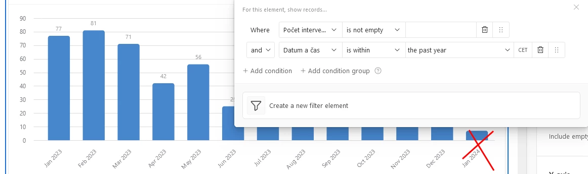 How can I set a condition in intefaces so that the chart displays data only from the last calendar year?