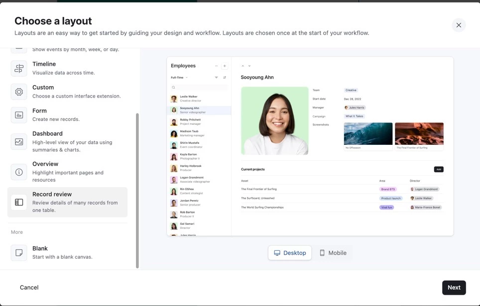 I’m trying to reproduce the Record Review layout shown in Airtable’s setup preview, the one with an employee list on the left and a large profile card on the right. In that preview image, the record detail area shows: