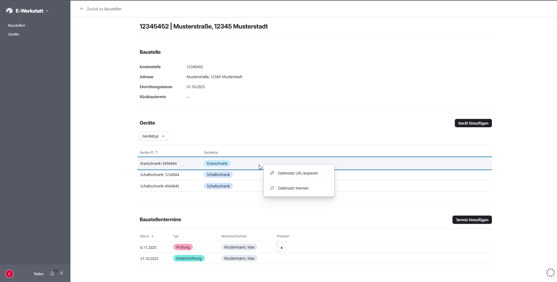Adding a new device works perfectly – I can use the “Gerät hinzufügen” button to select an existing record and link it to the construction site.