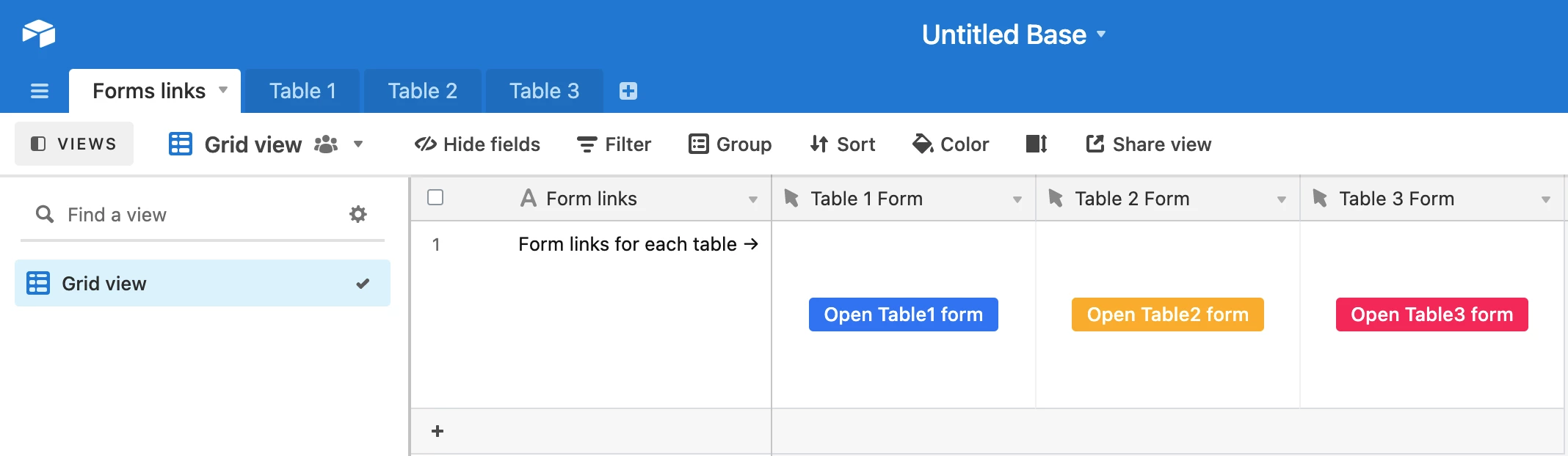The work around I am using it to put a new table in each base that simple has one record where each field is a URL link button that goes to various forms for tables in that base. I’ve only tested in the iPad app and it opens each form in Safari perfectly well. Definitely a hack, but a reasonably functional one for basic use cases.