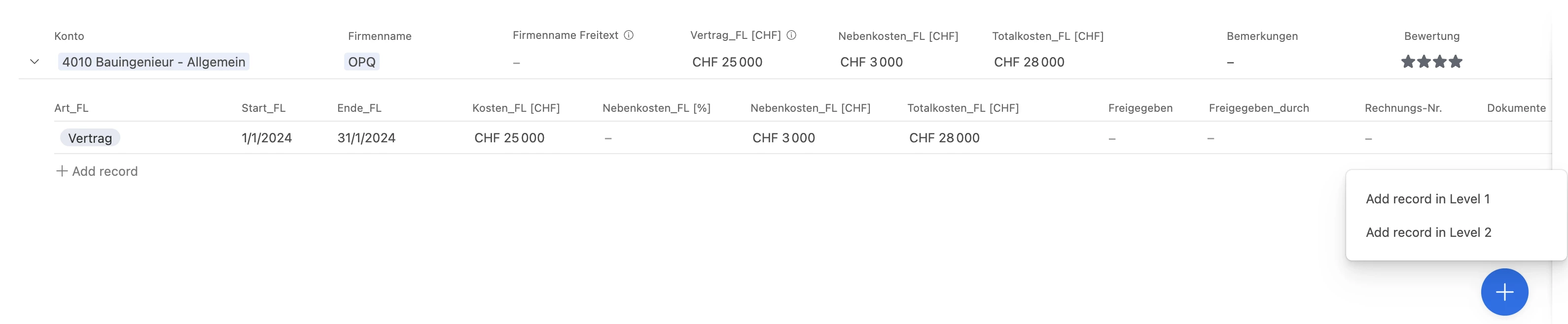 It only makes sense to add a record to the top level by means of the blue button. For lower records, you have the "+Add record" button on the right hand side.