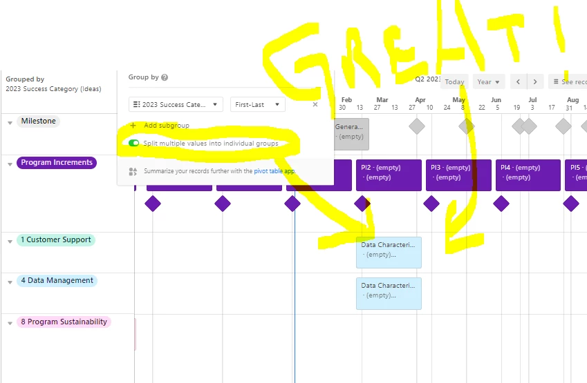 ...the gantt chart has a great feature to split multiple values (for a multi select field) into individual groups (see pic). This allows items with multiple selections to show under each one without creating combination groupings (which aren't useful to me).