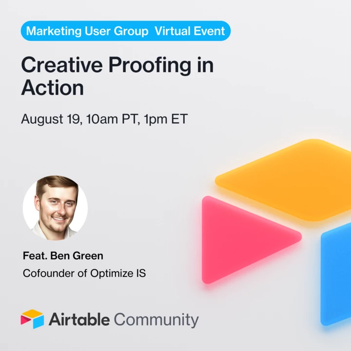 Join us on August 19, 2025 at 1:00pm EST for a live Airtable Marketing User Group session where we are diving into Airtable’s new Proofing feature built specifically to streamline creative reviews and approvals, all in one place.