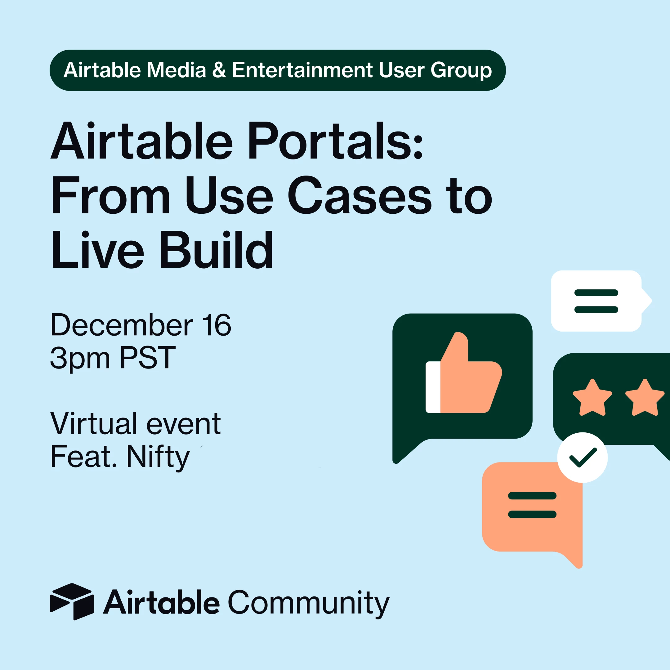 Join us for this special edition of our Media & Entertainment user group where you'll discover real-world Airtable Portal use cases that streamline workflows across intake, feedback loops, approvals, production coordination, and asset handoffs.