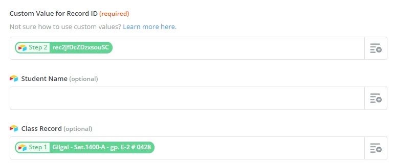 What and how do I write in zapier field "Class Record " (in Pic2)