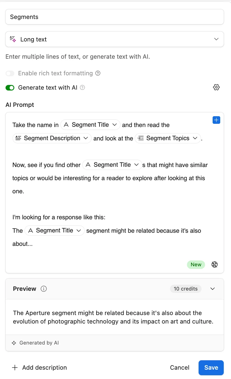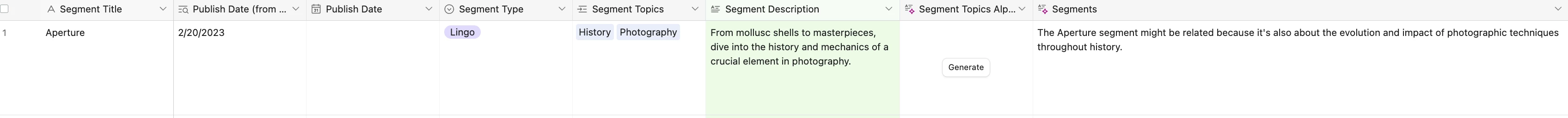 I run a content company and we have many different types of content and about 1,000 individual pieces of content. I would like to create an AI field that would provide recommended or related content by reading in the table the segment title and description. When I've tried it, it recommends ideas for new content related to that title or description, not related content within the table which is what I want. I've tried asking it to read cells using the {} brackets, but it still just suggests content ideas unrelated to what's in the table. Any suggestions? Thanks in advance!