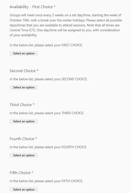 The functionality I'd like is, for each descending selection, the choice(s) made previously to be removed from the list (Ex: If Monday at 5pm was the #1 choice, then I'd like that choice to be removed from the 2nd choice question and so on). This would make it more user-friendly and avoid duplicate days/times being selected.