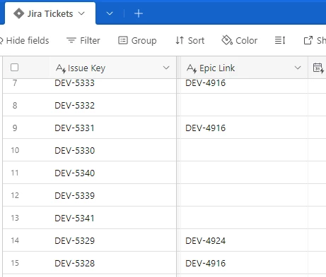I've tried syncing my Jira tickets into its own table which has the Epic <-> Tickets reference information but am unable to convert that information into a 'hard link' that Airtable can use. See screenshot, if I edit the 'Epic Link' field to "Link to another record" it technically works but I get a message saying my Jira Sync won't update this field anymore.