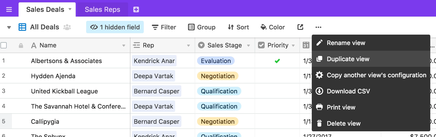 You can also duplicate the view you’re currently in to create a new view with the same filters, sorts, etc. that are applied in the current view. You might want to do this if, for example, you’ve been tinkering in your base’s Main View.
