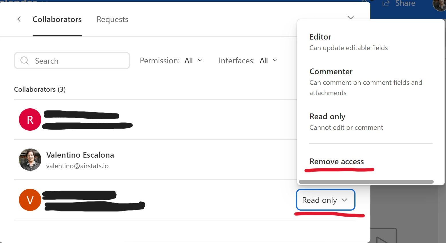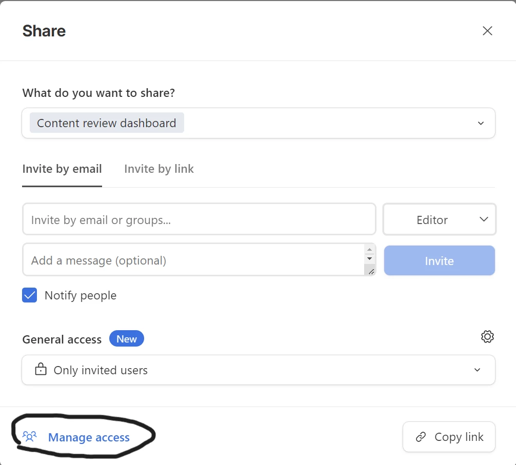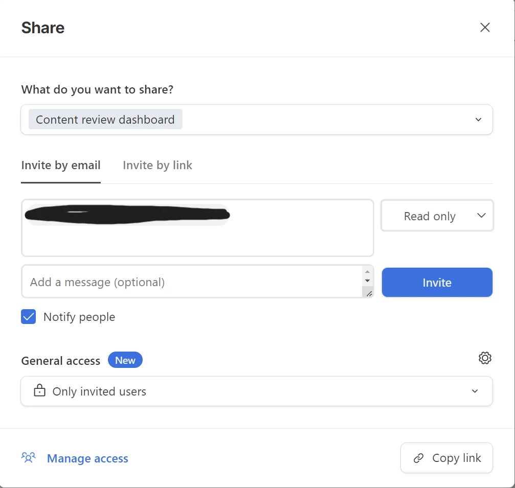 Step 1: Take them out as a read only user on the interface and resend them the email so they can access the interface again. You can do this on the screenshot 'Invite' and click 'Manage access'.