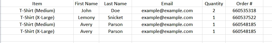 Merchandise is pulled from an exported CSV file made by our event registration website. The merch is “attached” by Order #, but show up as multiple rows if the type of merch is different (ie Large Shirt, Small Shirt)
