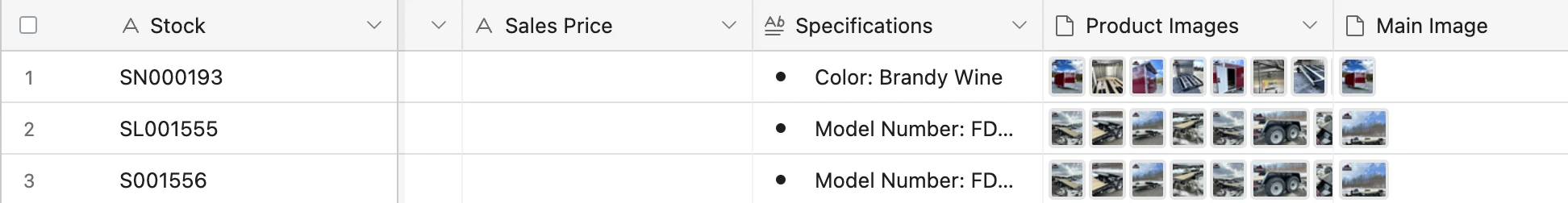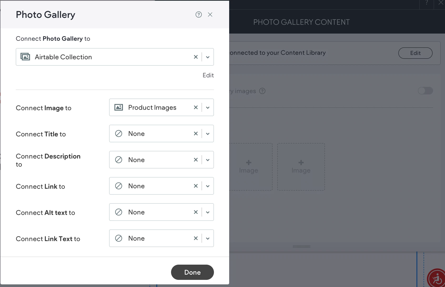 I am building an inventory table for a company that I am integrating into their duda website to display their products. On the main inventory page, the "main" image connects to the gallery widget with no issue. On the dynamic page that showcases each individual product, I'd like to highlight the 6-8 additional product images that I've uploaded into a field in Airtable titled "product images". When I connect a gallery widget to this field, nothing appears. Is it possible to connect a widget to a group of images? If not, how can I showcase all images without creating a separate field in airtable for each on and then connecting those fields to individual widgets on the site? Image attached of my setup.
