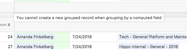This is one of Airtable’s extremely clever and helpful features except when it isn’t. In brief, when you create a new record from within a grouped view, Airtable automatically sets the value of the grouped-by field relative to the point in the view at which you created the record.¹ (It does something similar when you add a record from a filtered view.) The problem comes when you are grouping based on a computed field, as Airtable can’t really reverse engineer the calculation to determine how multiple values should be set. You’ll either have to find a way to group based on some sort of data field — for instance, assuming you are grouping based on the date range calculation, you could instead group on {WeekNum}