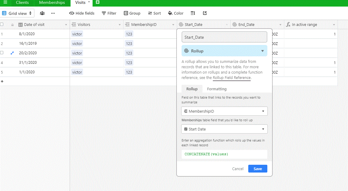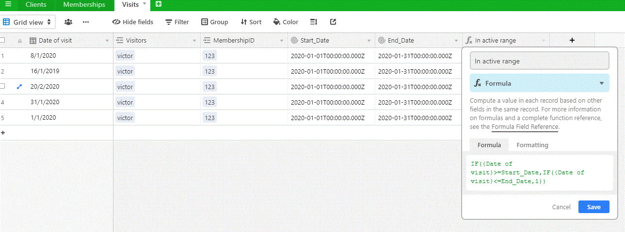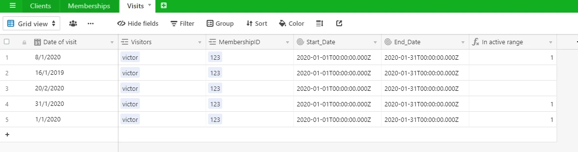 Each client purchase membership for 30—40 days. Every membership has {Start Date} and {End Date}. End Date field is calculated with formula by adding days to {Start Date}. Сlient shows up during membership period (once a day). Every visit fills up with form to Visits table.