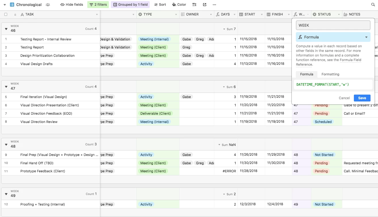 I am then grouping my table by week so I can track tasks according to the week we are currently operating in:
