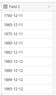 I am trying to build a database of historical events, but whenever I input the start date or end date of an event from another century, one day is automatically subtracted from the date for some reason. So, if I put in 12/12/1765, as soon as I leave the cell it transforms into 11/12/1765 and there is apparently no way I can correct this, even if I click on the correct date in the calendar. I don’t have this problem when I input dates from this year or in the future, and I don’t want to add a time field because the time is often not recorded. Is there any way I can fix this?