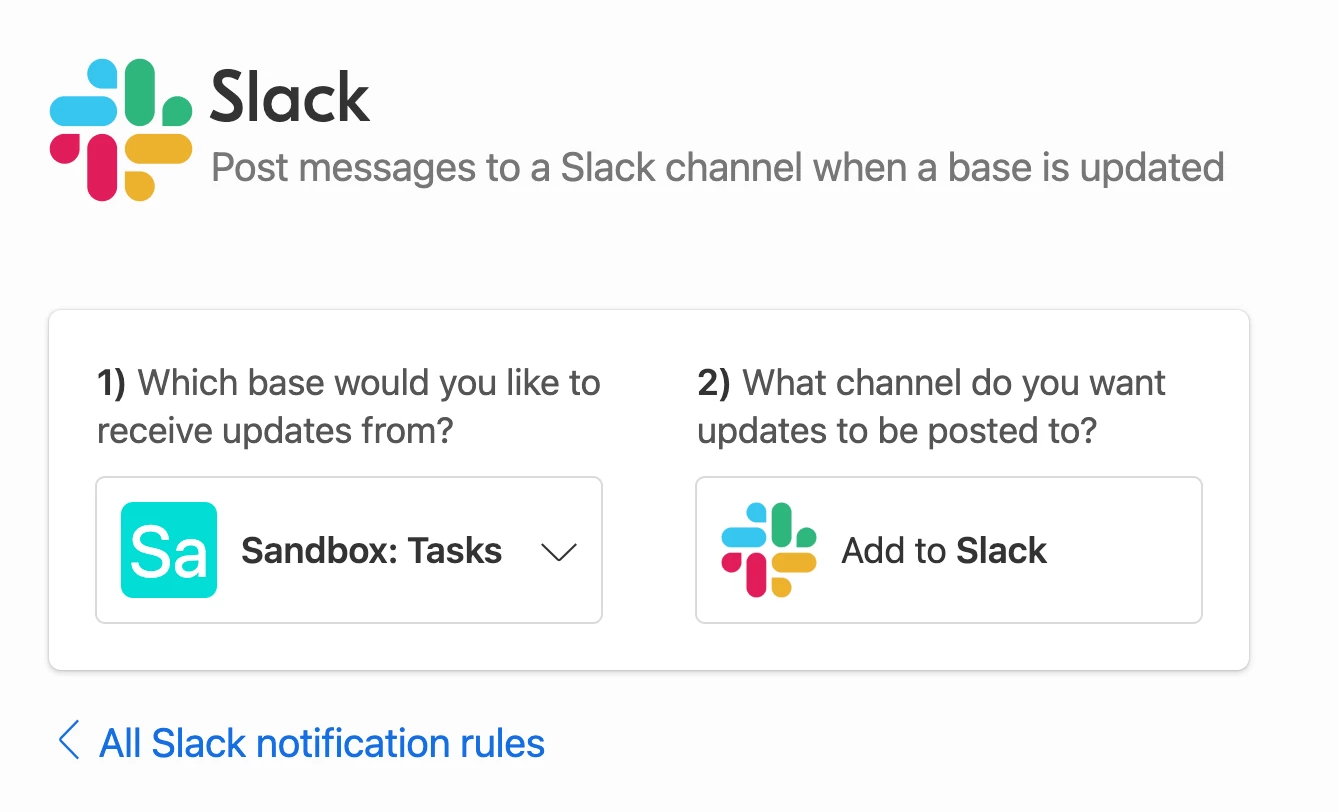 I would like to disconnect the general Slack Notifications from a base — the one that posts messages to a Slack channel whenever a base is updated, not a custom automation. I can't figure out how to disable the connection; when I click on "All Slack notification rules" the page comes up empty.