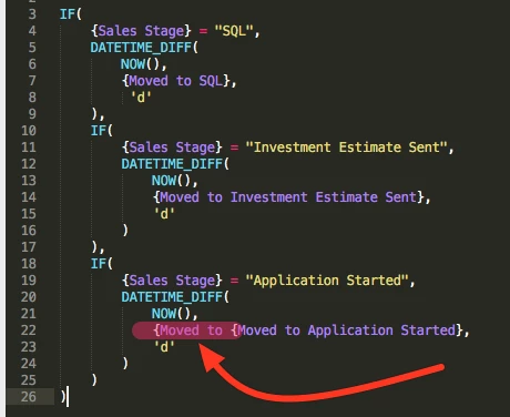 IF({Sales Stage} = "SQL", DATETIME_DIFF(NOW(),{Moved to SQL}, 'd'), IF({Sales Stage} = "Investment Estimate Sent", DATETIME_DIFF(NOW(), {Moved to Investment Estimate Sent}, 'd')),IF({Sales Stage} = "Application Started", DATETIME_DIFF(NOW(), {Moved to {Moved to Application Started}, 'd')))