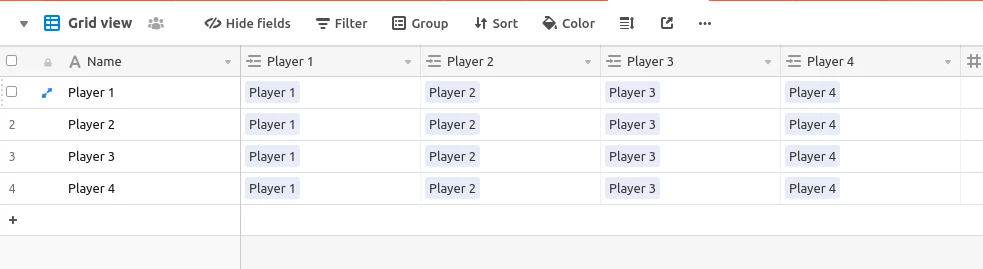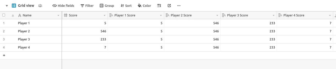 Your first problem is to get all of the other employees scores available to each record. So you’ll need Linked Record columns for each employee. Like this (I’ve used players instead of employees here):