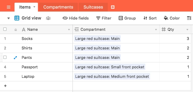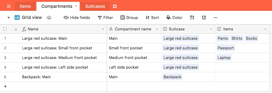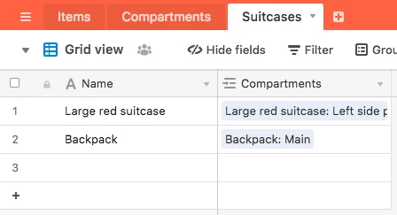 I am creating a database for packing for a trip. I have a table with items I am going to pack. I have Suitcase/Bag into which the item will be going. I would like to document which compartment of the Suitcase/bag the item will be going. For example - Items (sock) will go into the Suitcase in the Compartment (Main).