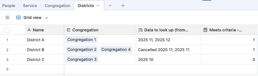 I want to report the number of Districts that had at least one Congregation that has a Service Record that meets the following criteria: