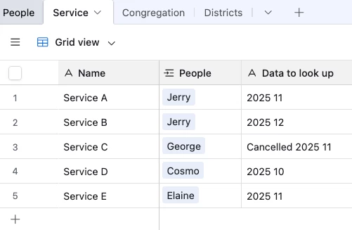 - Note: it is NOT linked to Service Records, but does have a lookup field to Service Records (from People).
