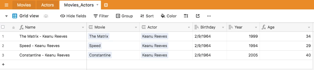 I am working on a movie database. One of the things I would like to do is show the age of the actor at the time of each film. I currently have a lookup that pulls the film year to the actor from the film table, and the actor age on their table. The issue is some actors obviously have done films in multiple years.