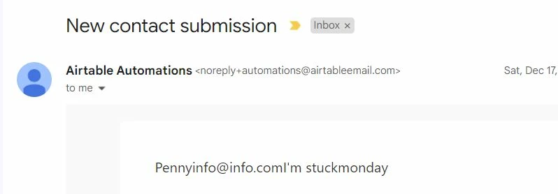 Hello there! New to AirTable. On a small website I have a small Contact Form that is populating data into my table inside of AirTable. It's all working just fine in a local site (not live yet, but it works) I only have a few fields, which are getting returned to am email notification automation, but the fields are all showing up in the email notification all squished together and look like this: Pennyinfo@info.comI'm stuckmonday