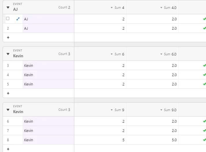 You need to have a 2nd table for the People. So it would have 2 records, AJ and Kevin in it (plus any other people you might require). You can then link the events in the table above to the records in your new People table. Once you have done that, you can use a Roll Up field in the People table to sum all of the values in your Quantity field (in the original table) that are linked to that person.