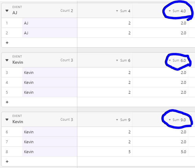 You’ll end up with sections that have summary bars on them. You’ll have a top-level section for “AJ”, and a summary bar that shows AJ’s total Quantity for all dates. But then inside the AJ section, you have sub-sections, one for each “Date” (which presumably represents an event). Each “Date” section will also have its own summary bar, showing AJ’s total Quantity for just that Date.