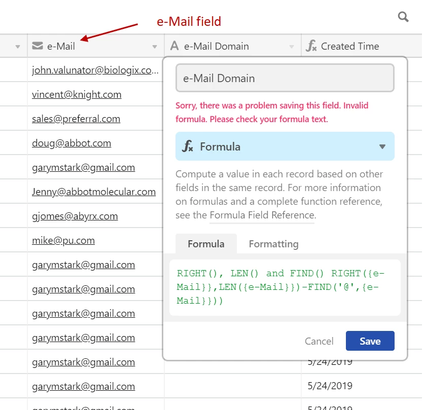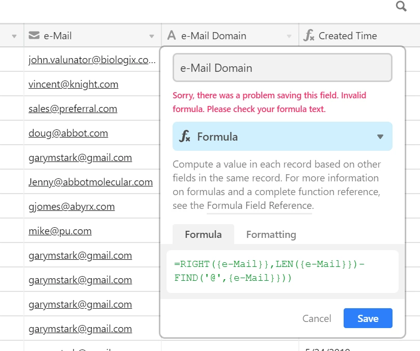 I’d like to strip the domain from the email address. It can be done with RIGHT, LEN, and FIND in Excel but I’m having trouble translating it to Airtable. Can anyone help?
